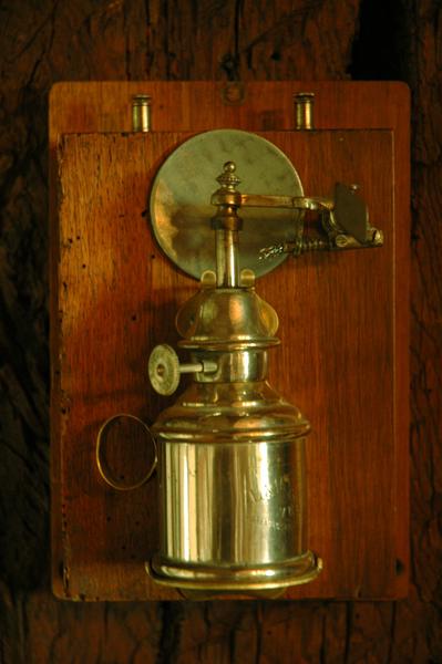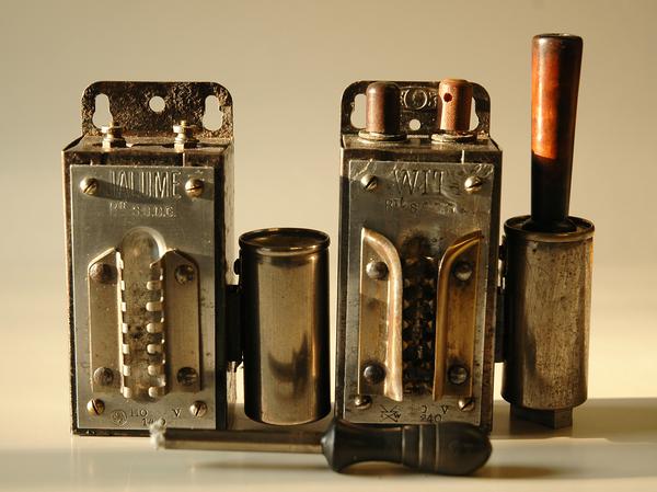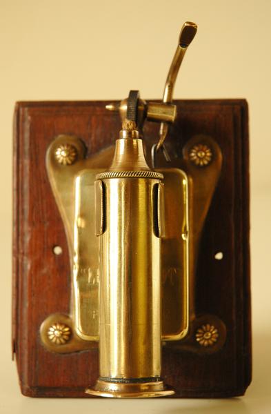 Un autre allumoir électrique en bakélite, des années 1930, branché sur le secteur (110 V). Lorsque l’on touchait les deux petites lamelles placées dans l’encoche avec le bout métallique, porte-mèche du réservoir, cela mettait en fonction un petit vibreur (on voit le ressort de rappel), portant en son extrémité une rondelle en laiton, qui venant frapper une autre pièce métallique fixe, produisant des étincelles qui allumaient la mèche.