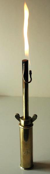 La mèche intérieure va du réservoir jusqu’en haut du gros tube. Avec une flamme, on réchauffe le tube supérieur, l’essence contenue dans la mèche se vaporise et le gaz sort par le petit tube terminé par un trou calibré. La flamme doit lécher le tube qui enveloppe la mèche afin que sa chaleur permette à la gazéification de se poursuivre.