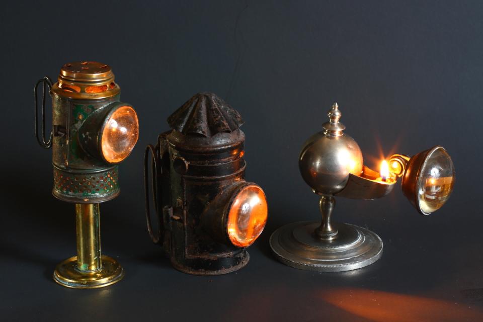2. Petite lanterne dite « de voleur », celle-ci ayant été en fait utilisée par des douaniers. Elle contient une petite lampe à huile végétale dont la chiche lumière est focalisée par la lentille. La lampe comporte aussi un volet qui permet de masquer complètement la lumière et de la retrouver immédiatement au besoin.